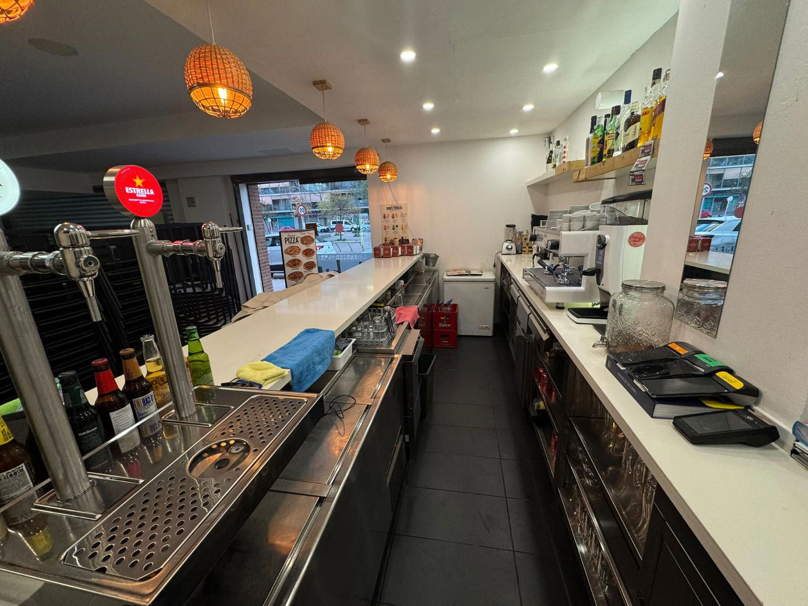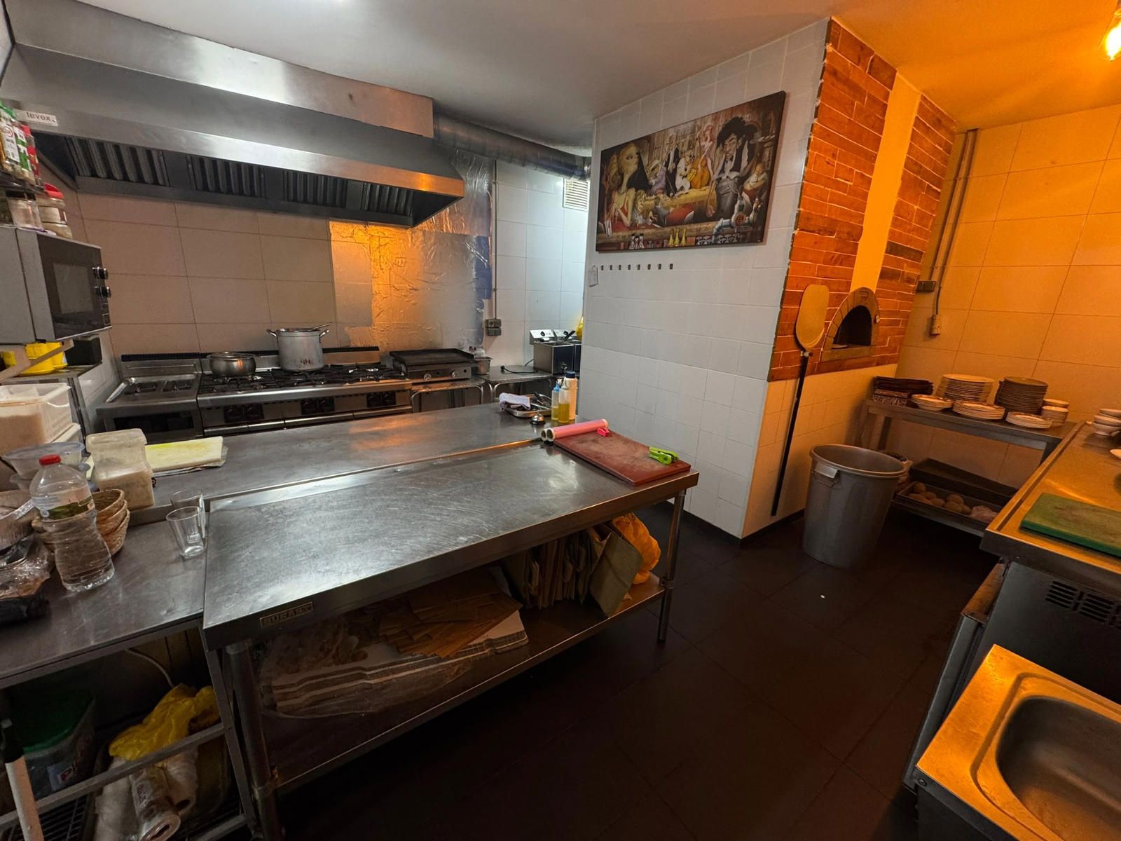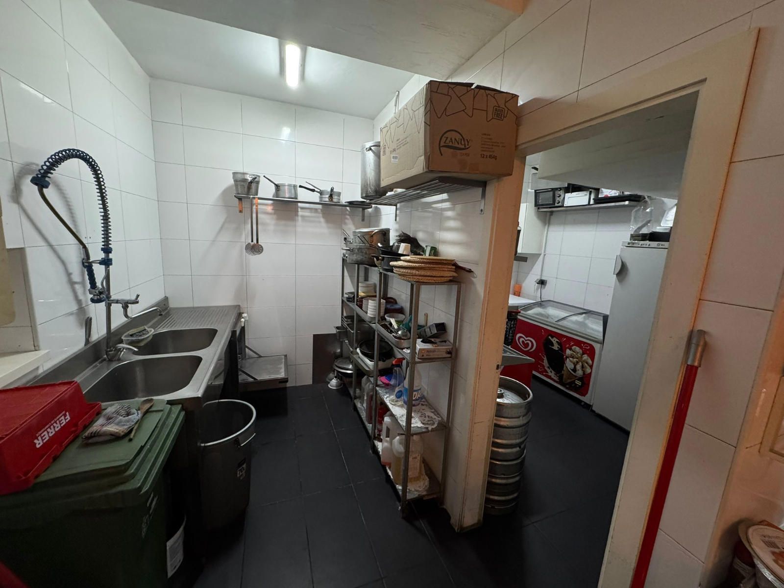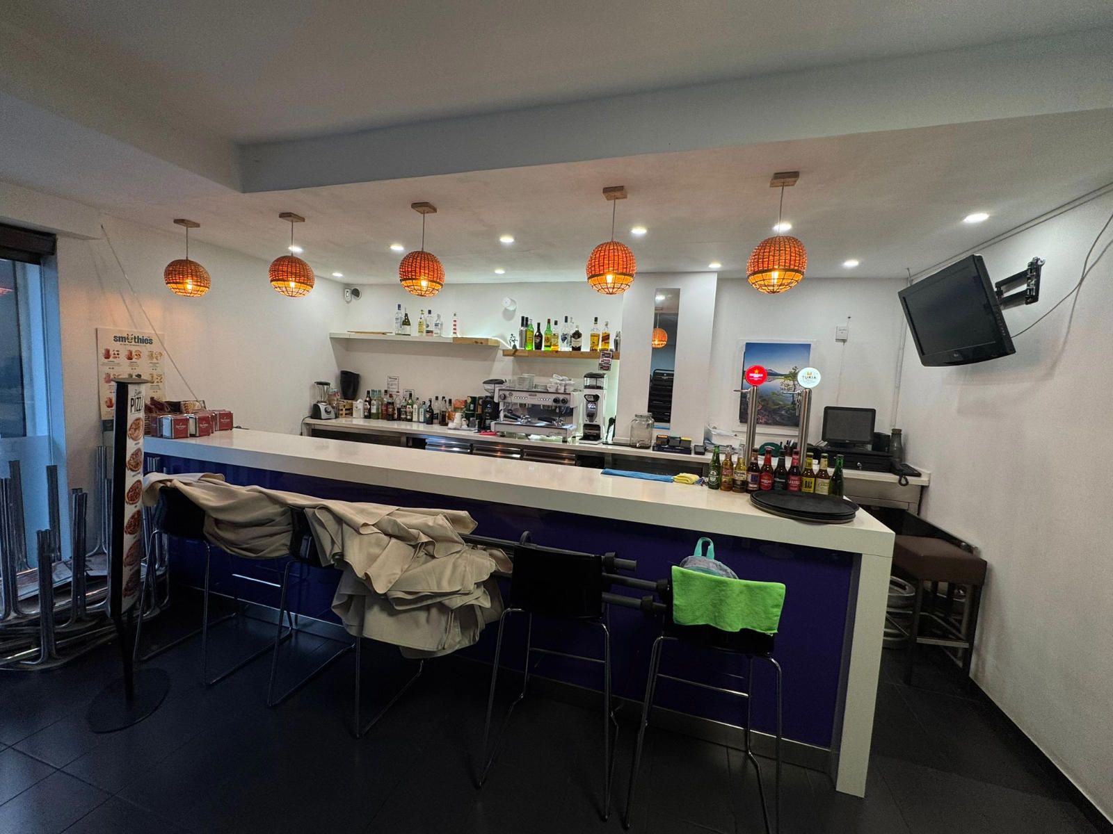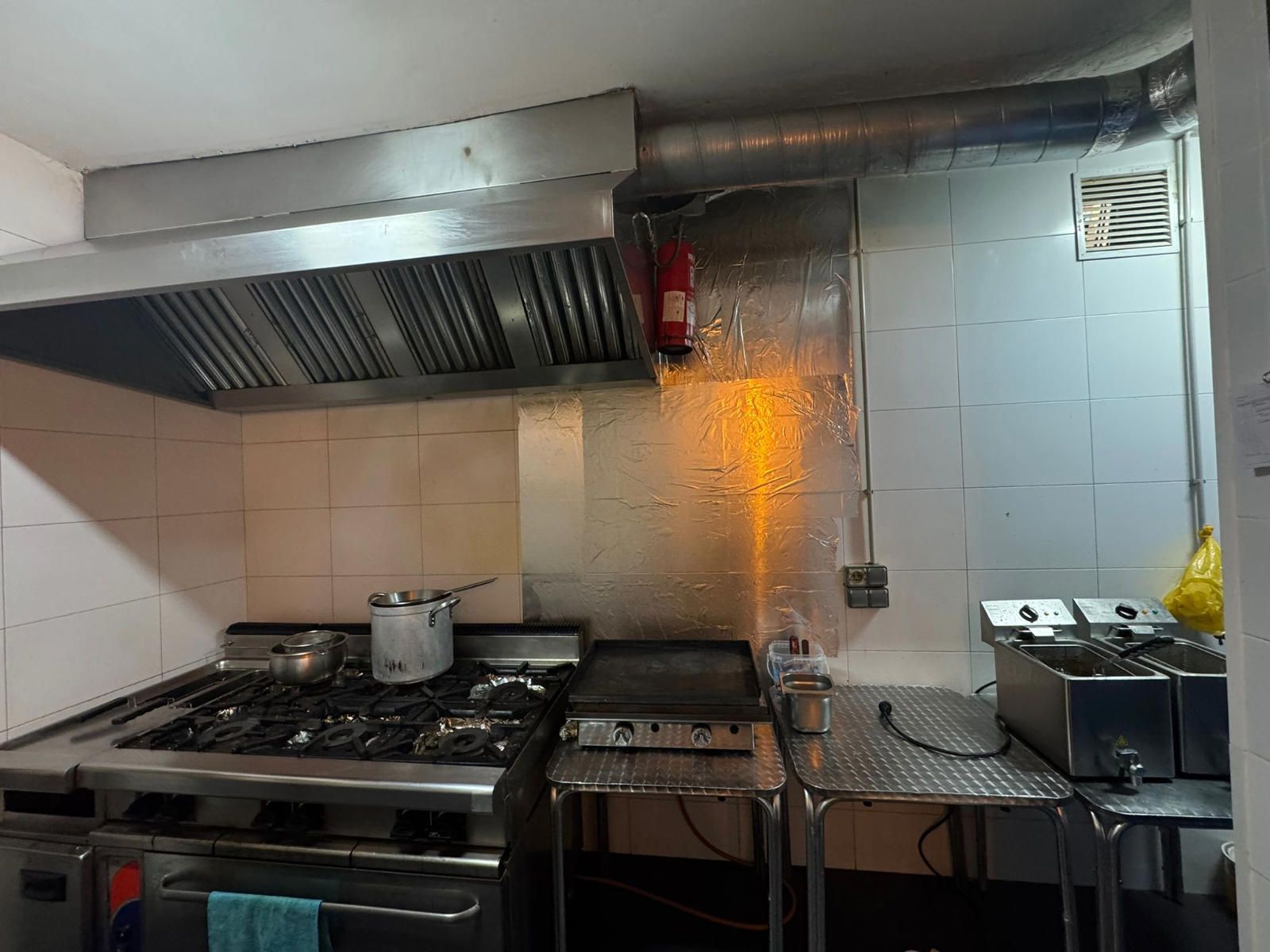Entre el equipamiento incluido encontramos una barra completa con caja registradora con pantalla táctil, máquina de café profesional, dos refrigeradores y un congelador en barra. La cocina profesional dispone de cocina industrial de seis fuegos, horno de leña, dos freidoras, campana extractora completa, lavavajillas industrial, nevera y cuatro mesas de trabajo, lo que facilita una operativa ágil en horas punta. En la zona de almacén se ubican cuatro congeladores adicionales, además de un congelador horizontal, y el local cuenta también con una televisión de 50 pulgadas.
