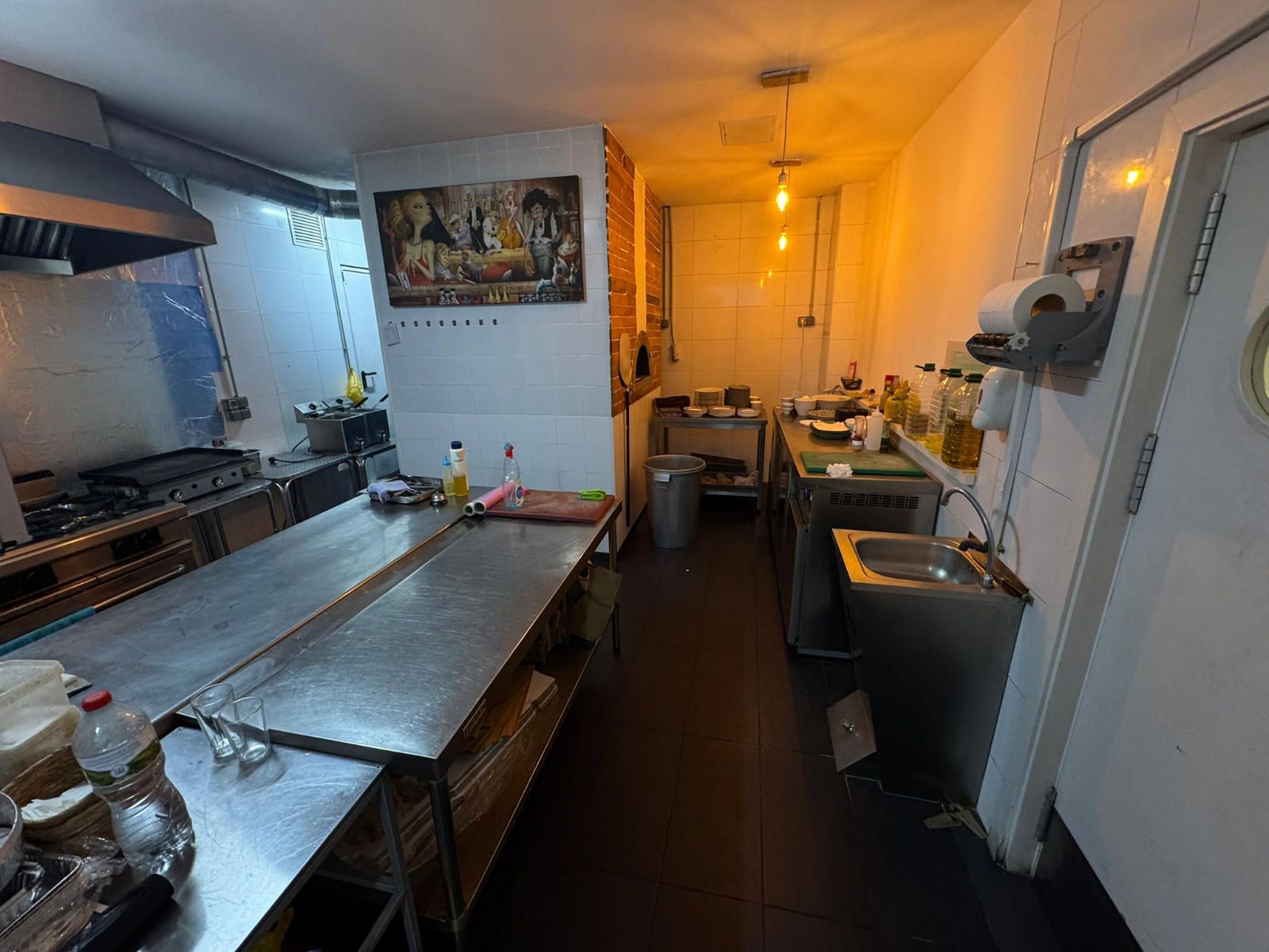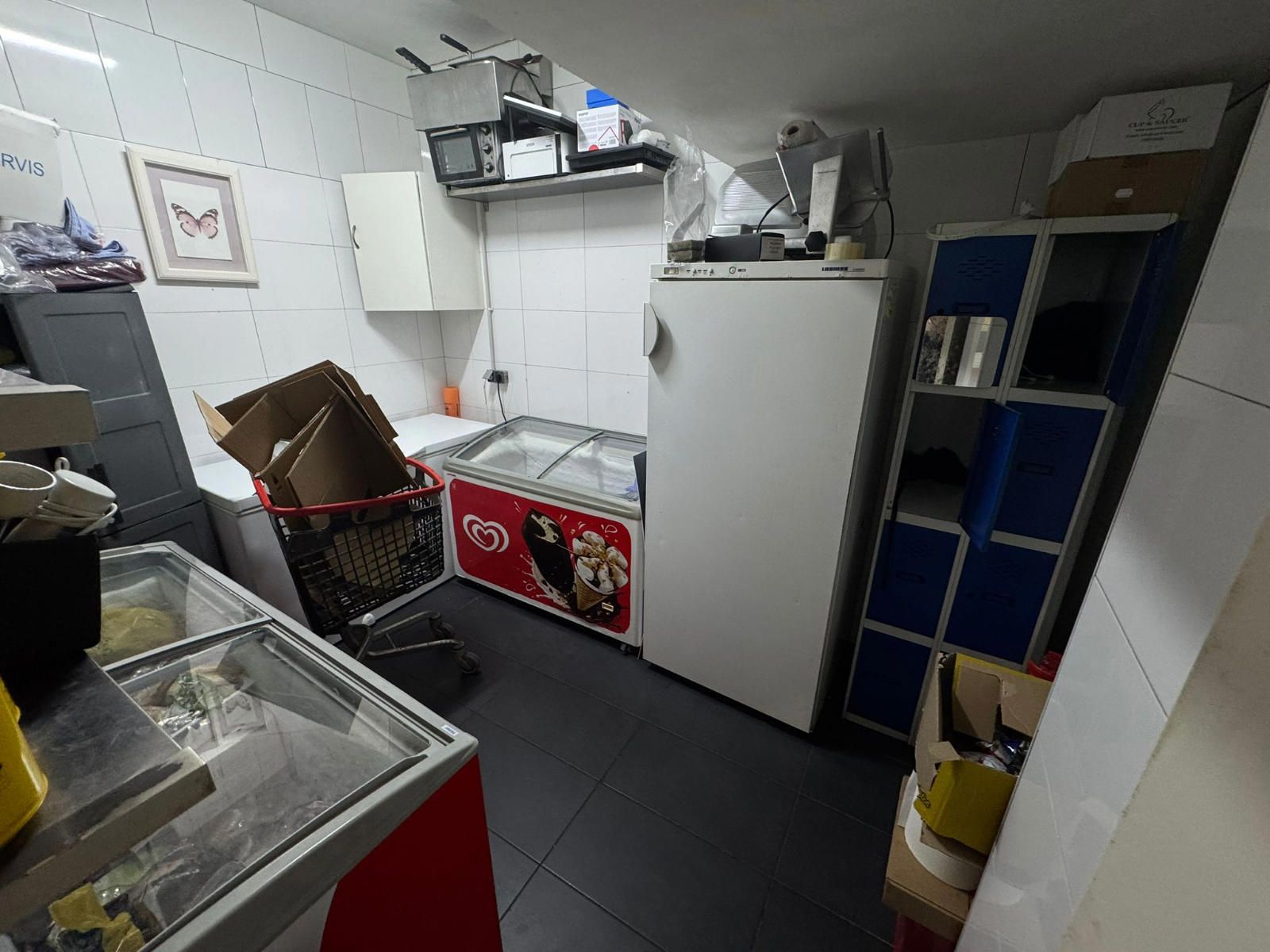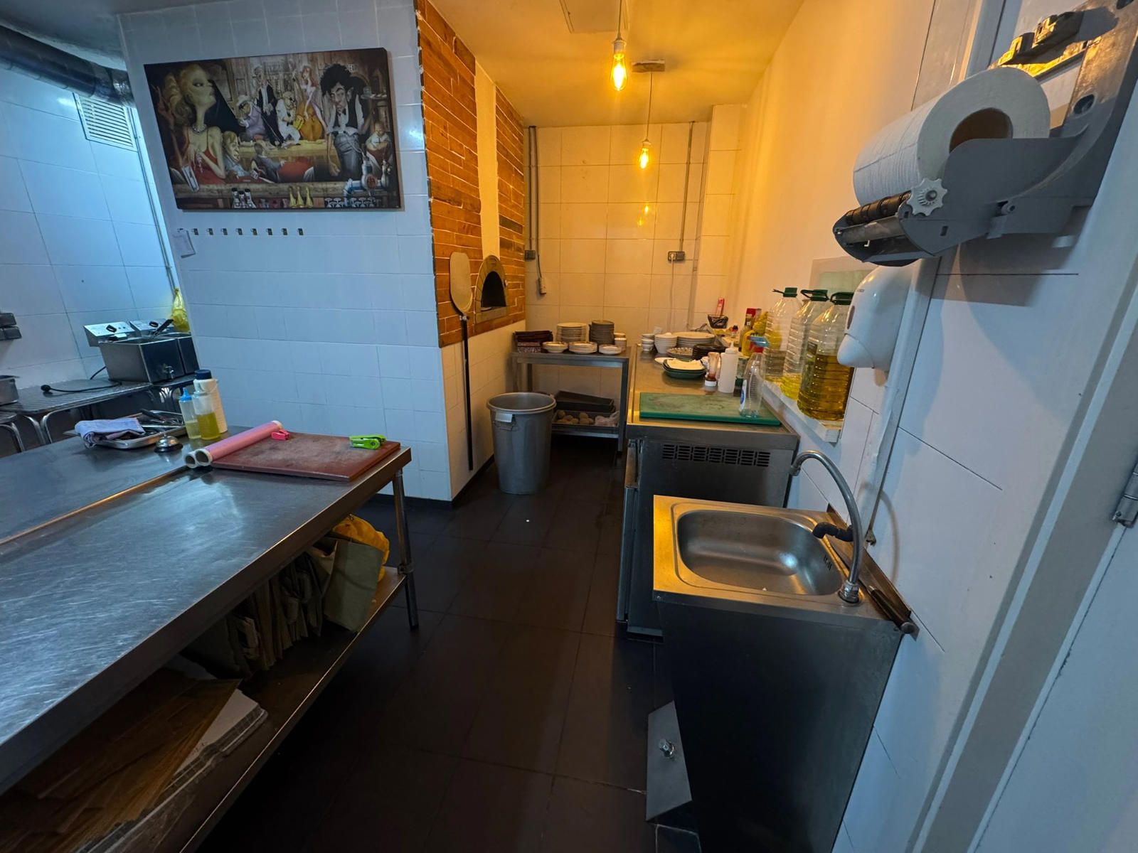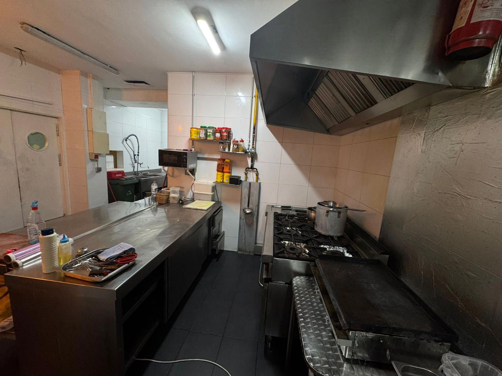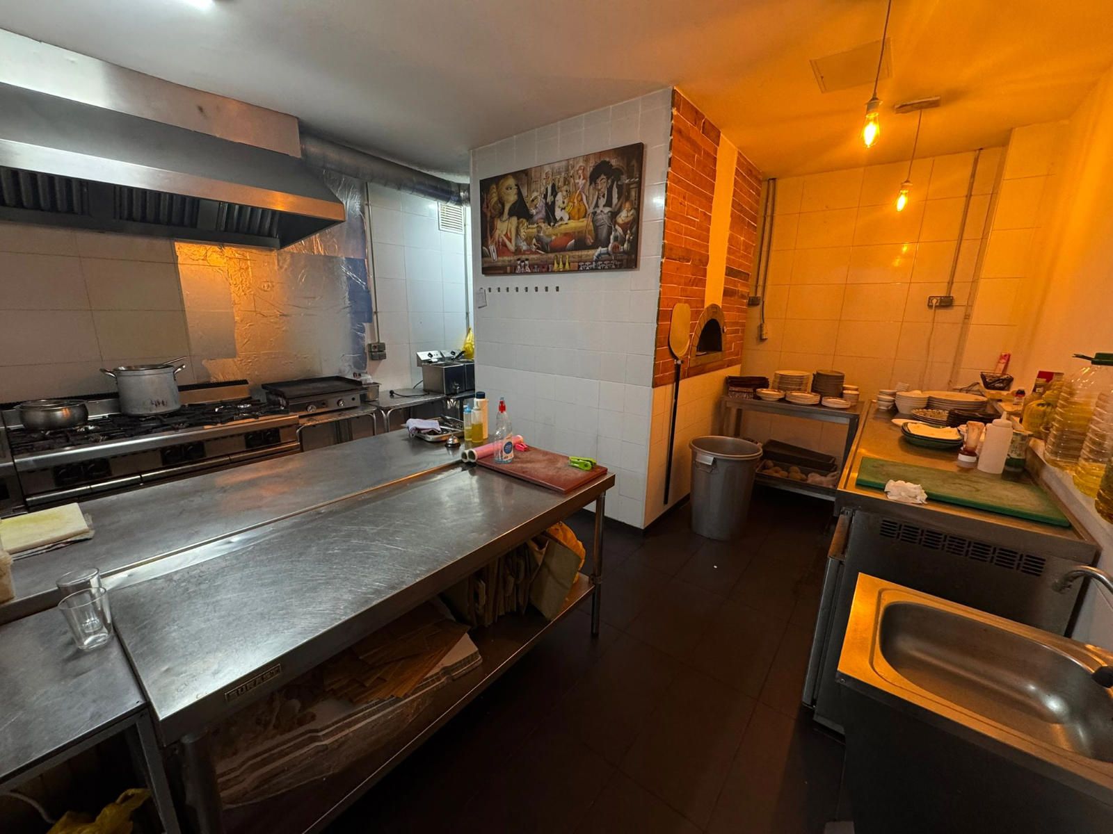 Entre el equipamiento incluido encontramos una barra completa con caja registradora con pantalla táctil, máquina de café profesional, dos refrigeradores y un congelador en barra. La cocina profesional dispone de cocina industrial de seis fuegos, horno de leña, dos freidoras, campana extractora completa, lavavajillas industrial, nevera y cuatro mesas de trabajo, lo que facilita una operativa ágil en horas punta. En la zona de almacén se ubican cuatro congeladores adicionales, además de un congelador horizontal, y el local cuenta también con una televisión de 50 pulgadas.
